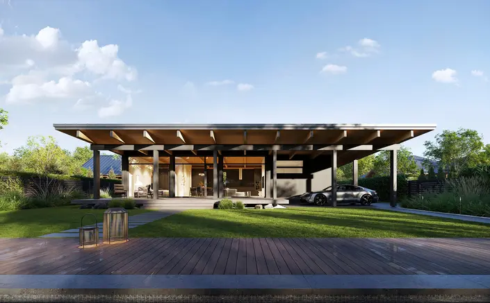 This is a project of a small weekend house where the client can spend their free time enjoying nature and swimming in the pool. The main focus is on simple and durable solutions that require little effort to keep the building in proper condition. The pile foundation ensures trouble-free operation, which is especially important under frequent thermal cycles. The wooden frame is lightweight and quick to assemble, while the single-pitched roof directs all precipitation toward the fence. The wooden structures are painted black, allowing the house to remain neutral in relation to nature and the surrounding buildings. The roof also shelters the terrace and the carport from the elements, making it possible to spend time outdoors comfortably even in bad weather.
